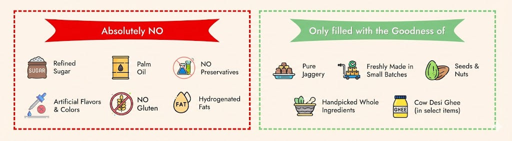 β’ Pure Jaggery Goodness: We use only Natural Sugarcane JaggeryβNo refined Sugar, ever.